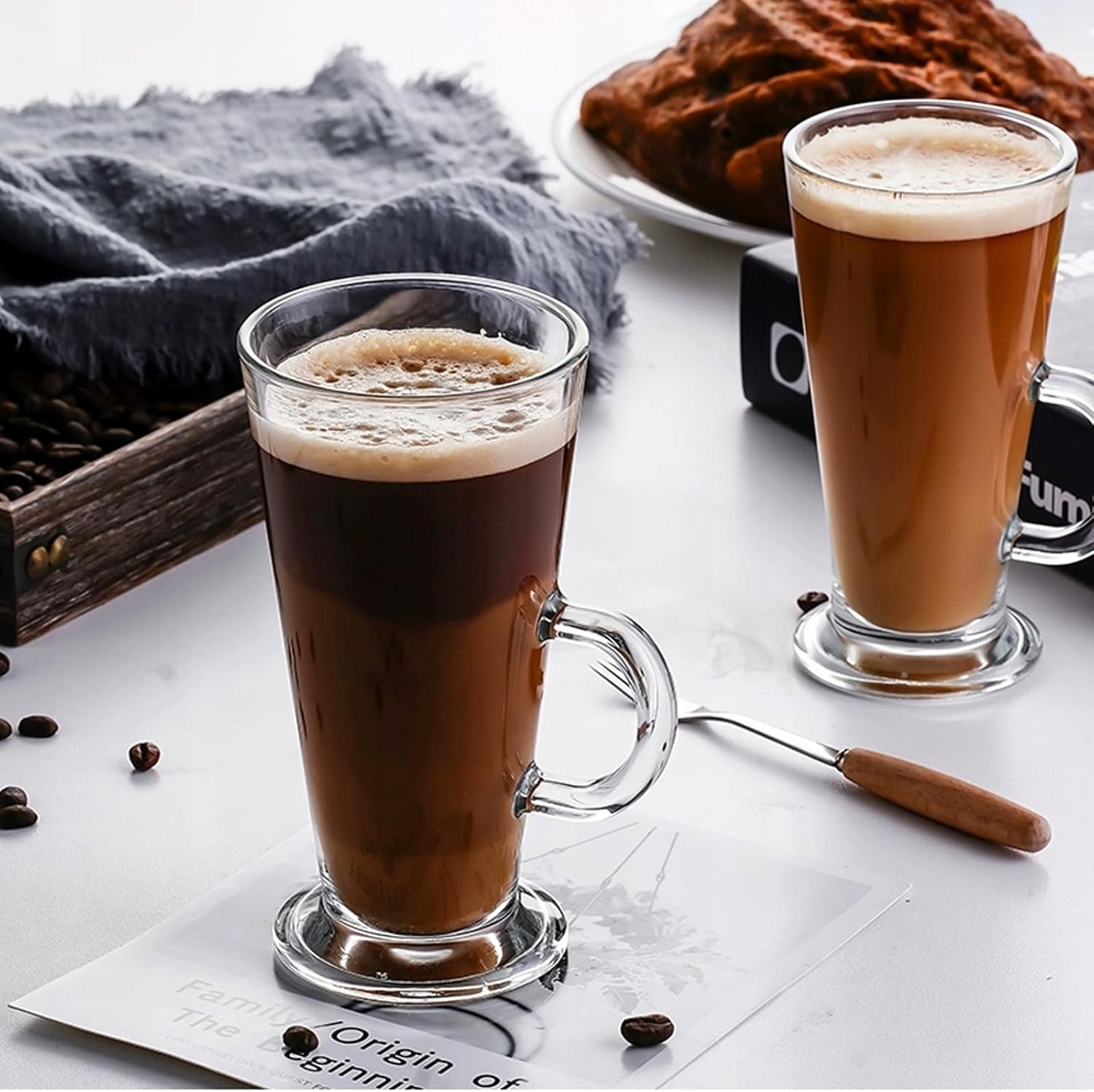 Szklanki zostały wykonane z wysokiej jakości transparentnego szkła, które zapewnia trwałość oraz estetyczny wygląd. Dzięki odporności na zmiany temperatury doskonale sprawdzają się zarówno do gorących napojów, takich jak latte, cappuccino czy herbata, jak i do zimnych koktajli lub deserów.